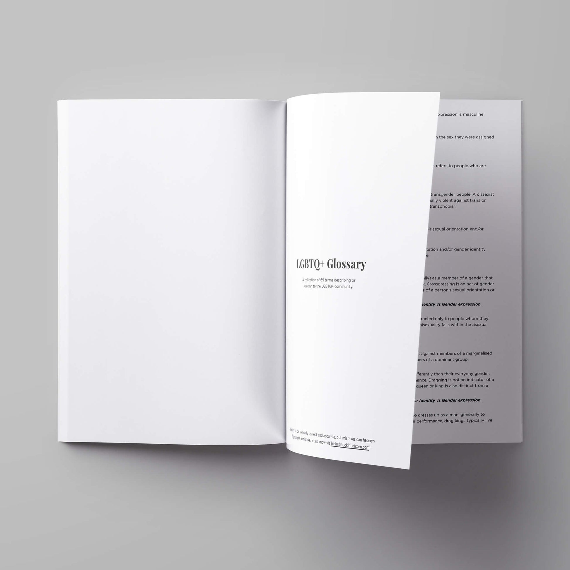 - 10 pages of LGBTQ+ Glossary at the end, containing 69 terms related to the community