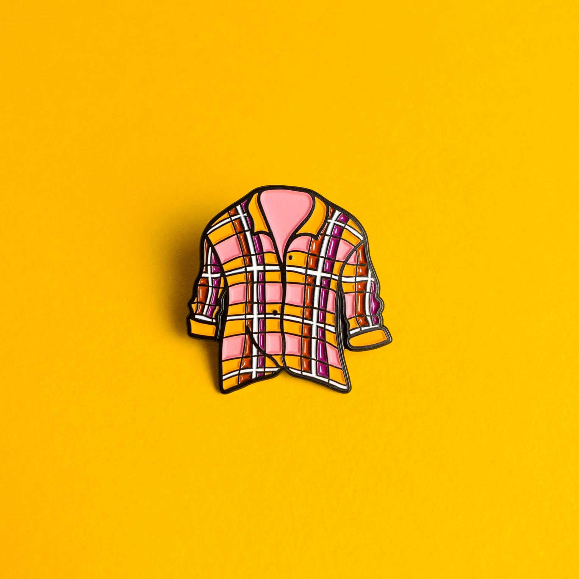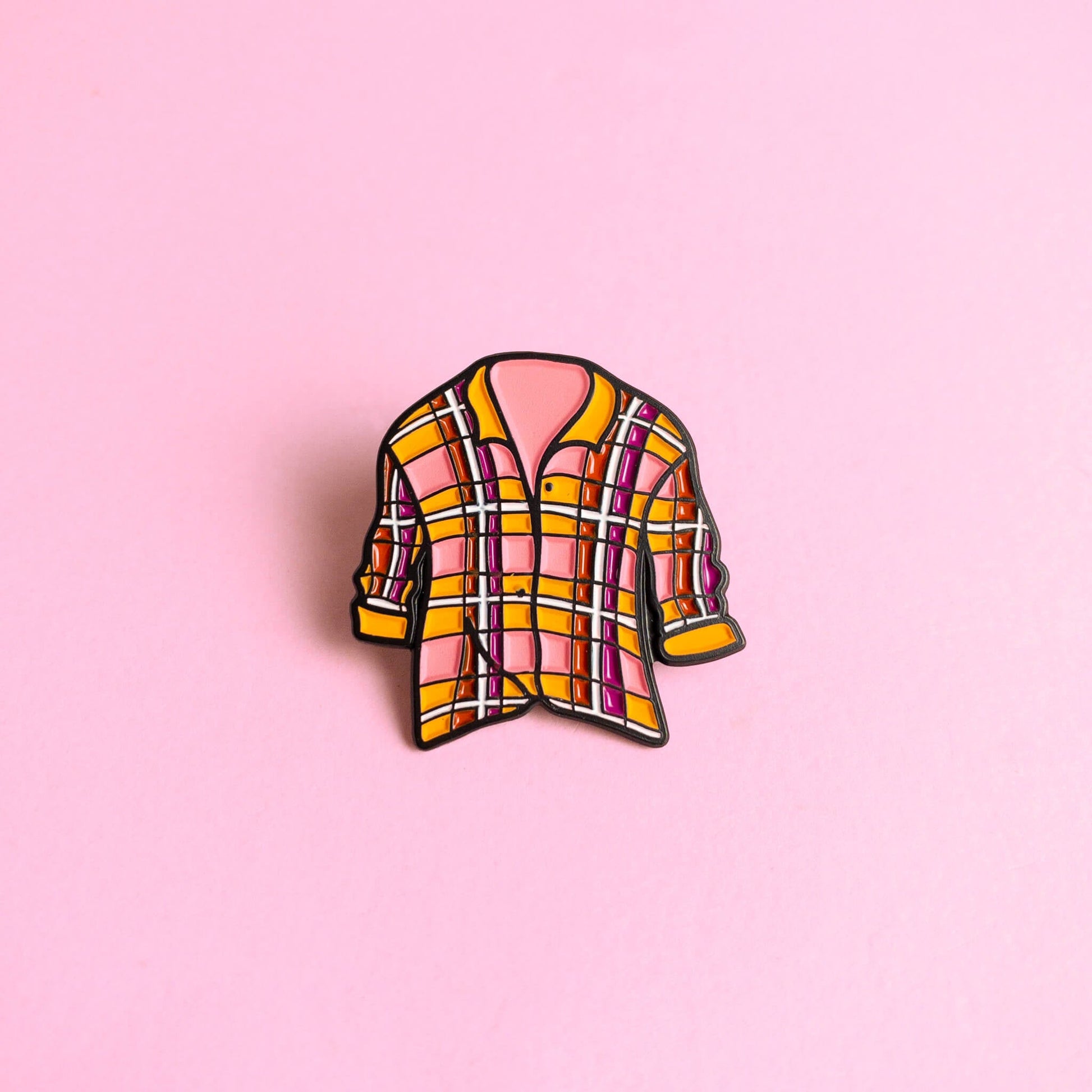 Flaunt your subtle lesbian pride with this cute flannel pin that sports the lesbian pride flag colours!