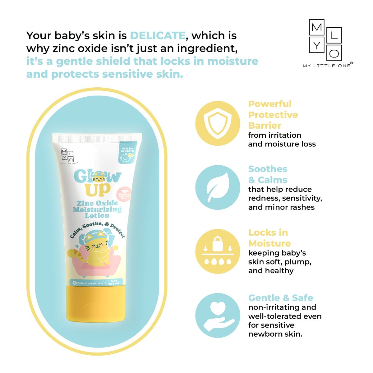 The MyLO Glow Up Zinc Oxide Moisturizing Lotion is a gentle yet powerful barrier cream that protects newborn and sensitive skin with the natural shield of zinc oxide. Enriched with soothing plant extracts, it hydrates, calms, and restores comfort, giving parents peace of mind from the very first day.