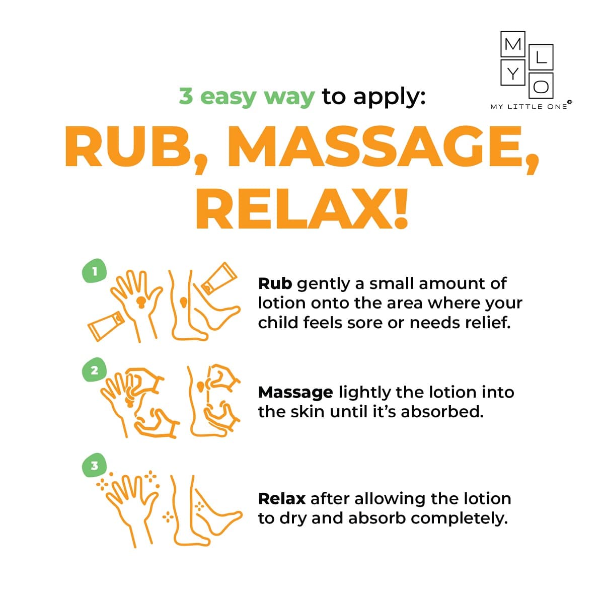 1. Gently rub a small amount of lotion onto the area where your child feels sore or needs relief