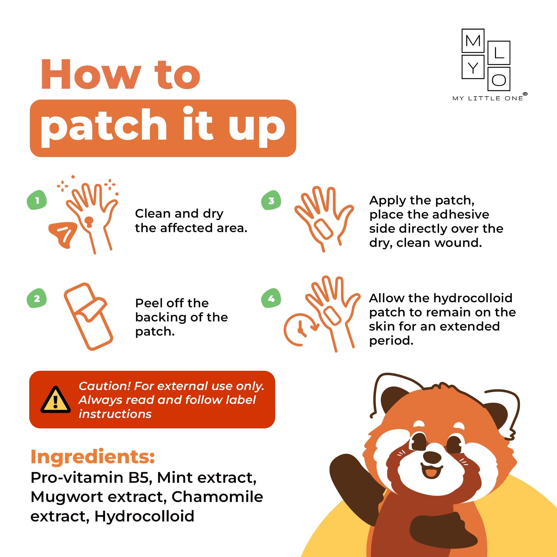 Ensure the affected area is clean, then gently apply the patch without touching the adhesive side. Avoid use if allergic to any listed ingredients. If you notice a rash, itching or swelling, discontinue use.