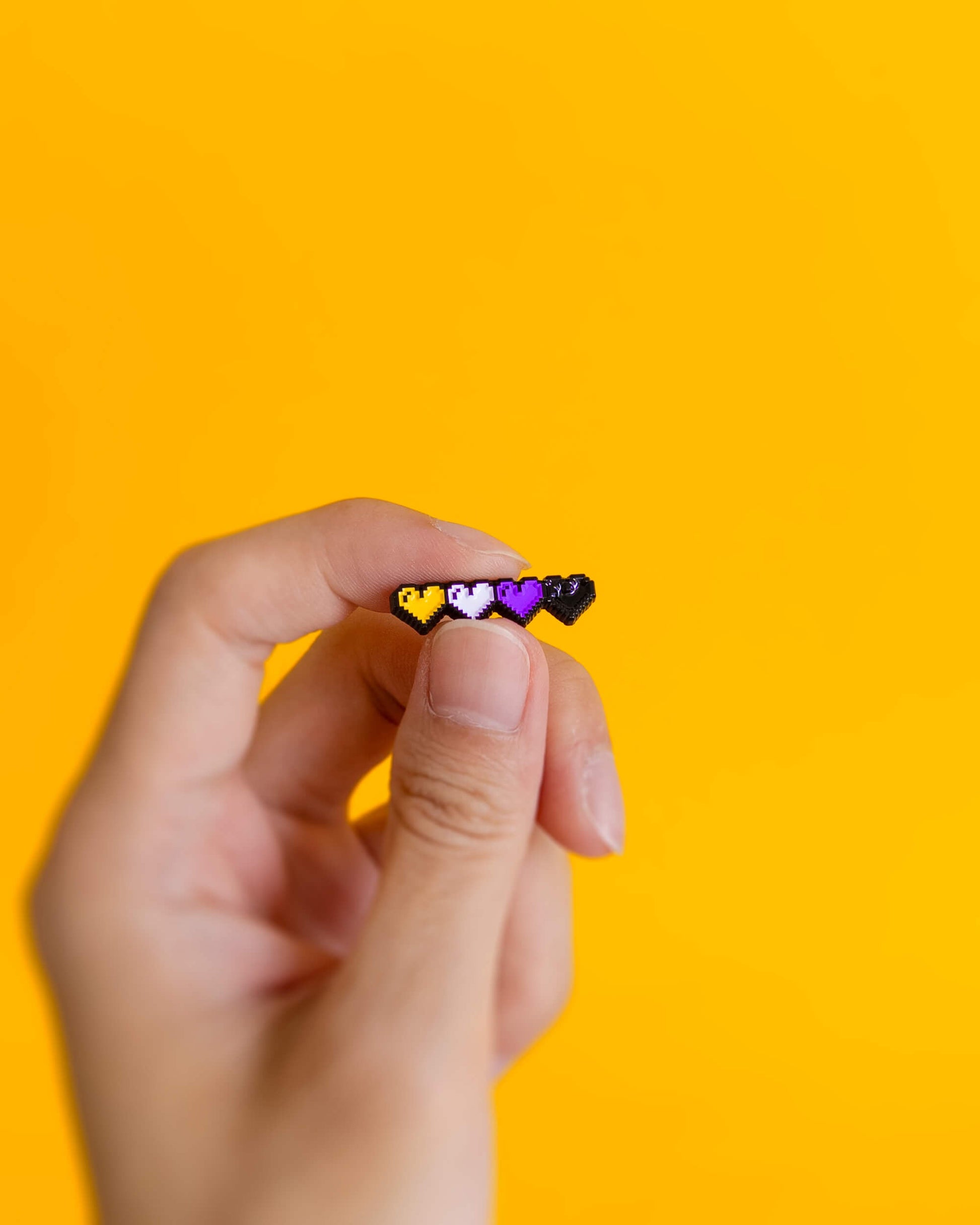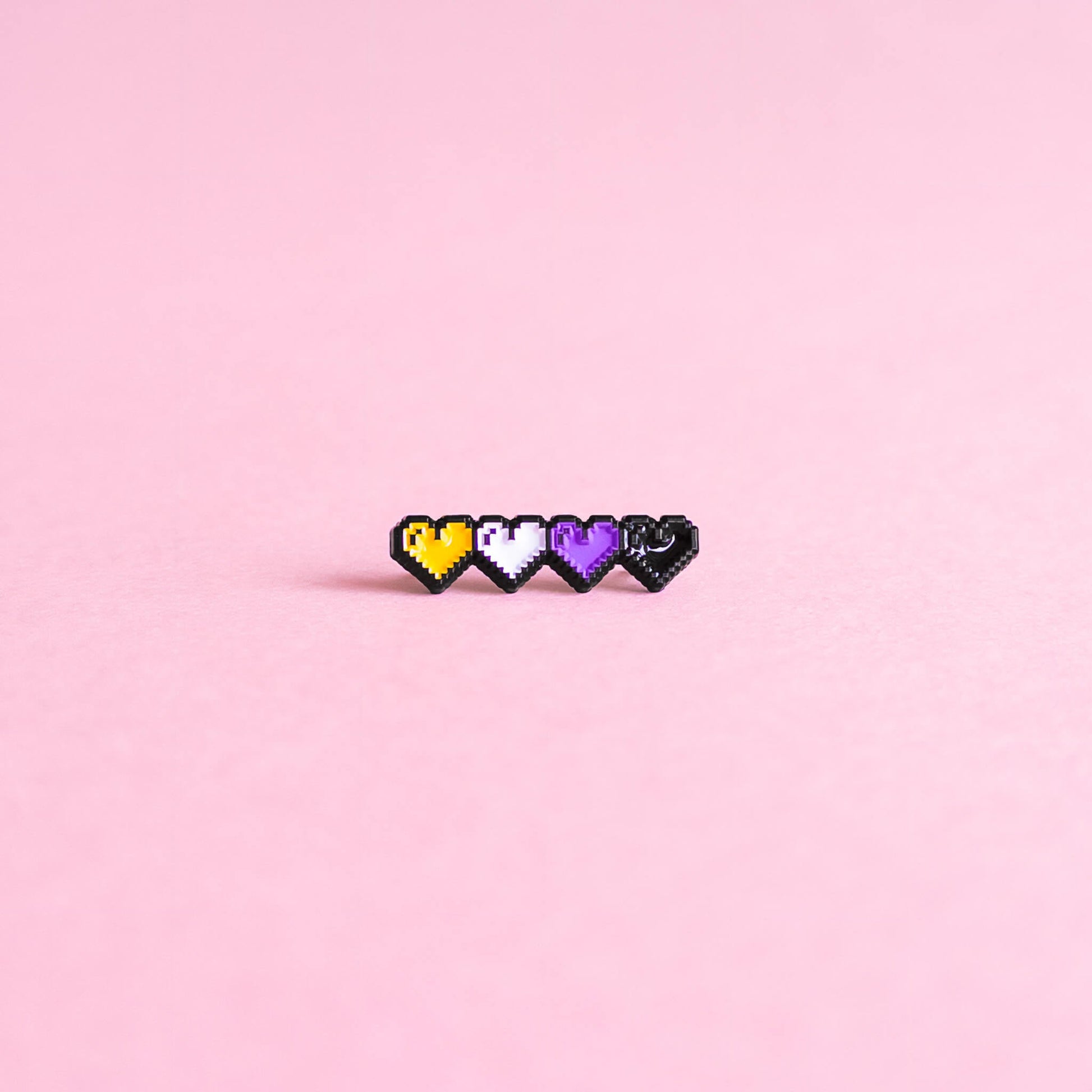 Wear your heart on your sleeve with this cute pixel heart pride pin! This non-binary pixel hearts pin comes with 5 tiny pixel hearts 🥹