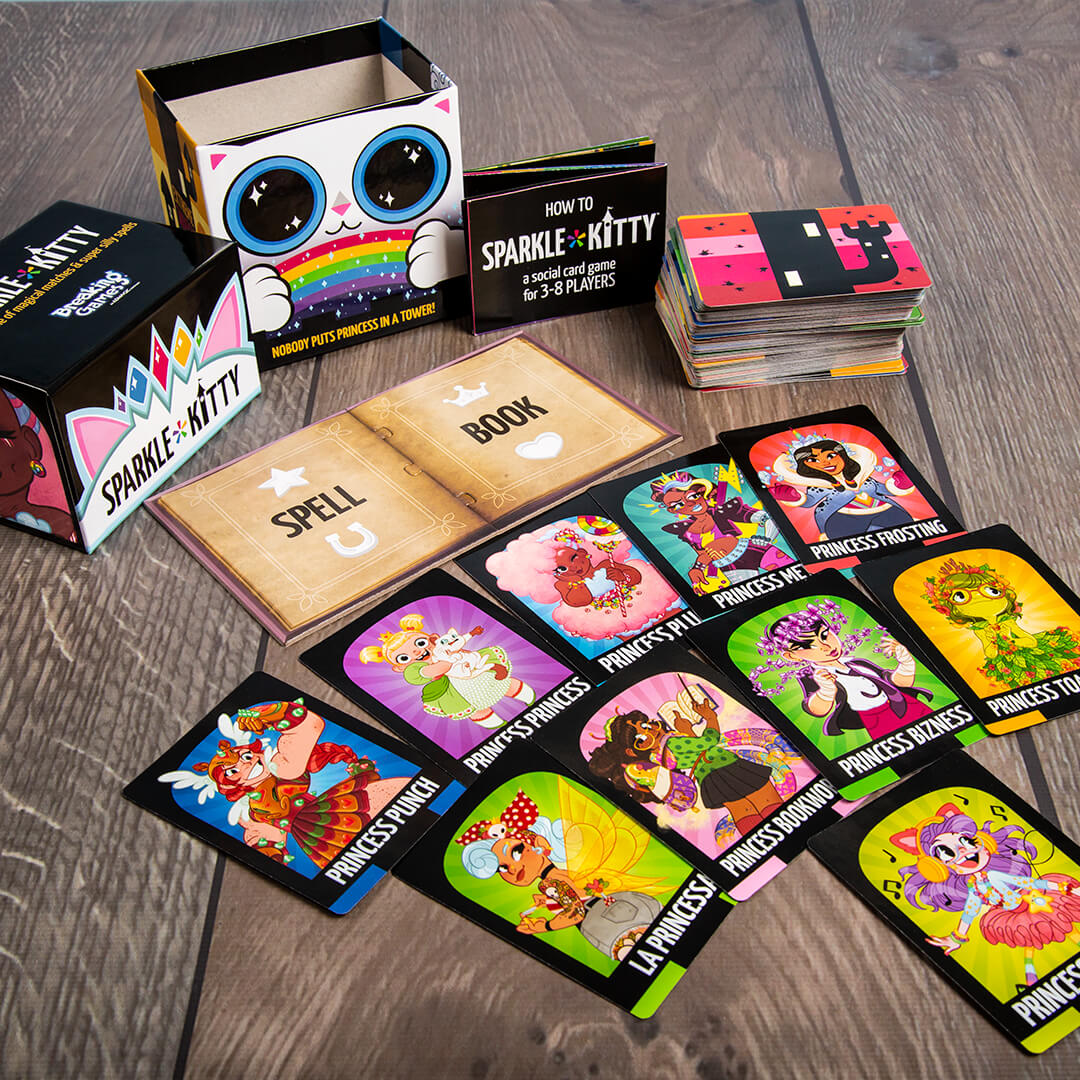 Sparkle*Kitty is an adorably fun, social, and magical spell card game for all ages, sizes and genders. Once upon a time, a group of powerful princesses were captured and locked away in Cursed "No Cursing" towers by the evil queen Sparkle*Kitty! All their words and magic spells vanished and became sugar & spice... almost everything nice.
