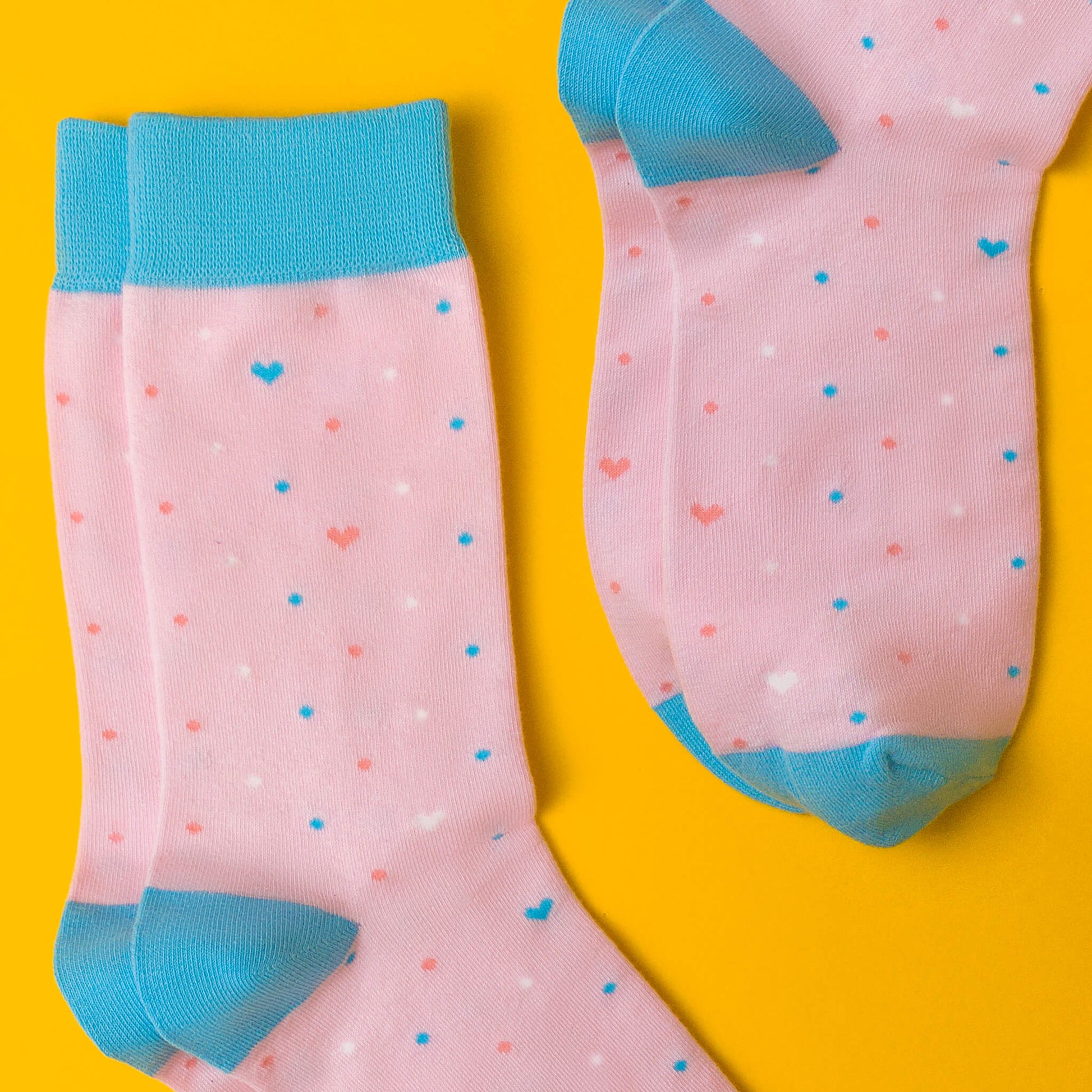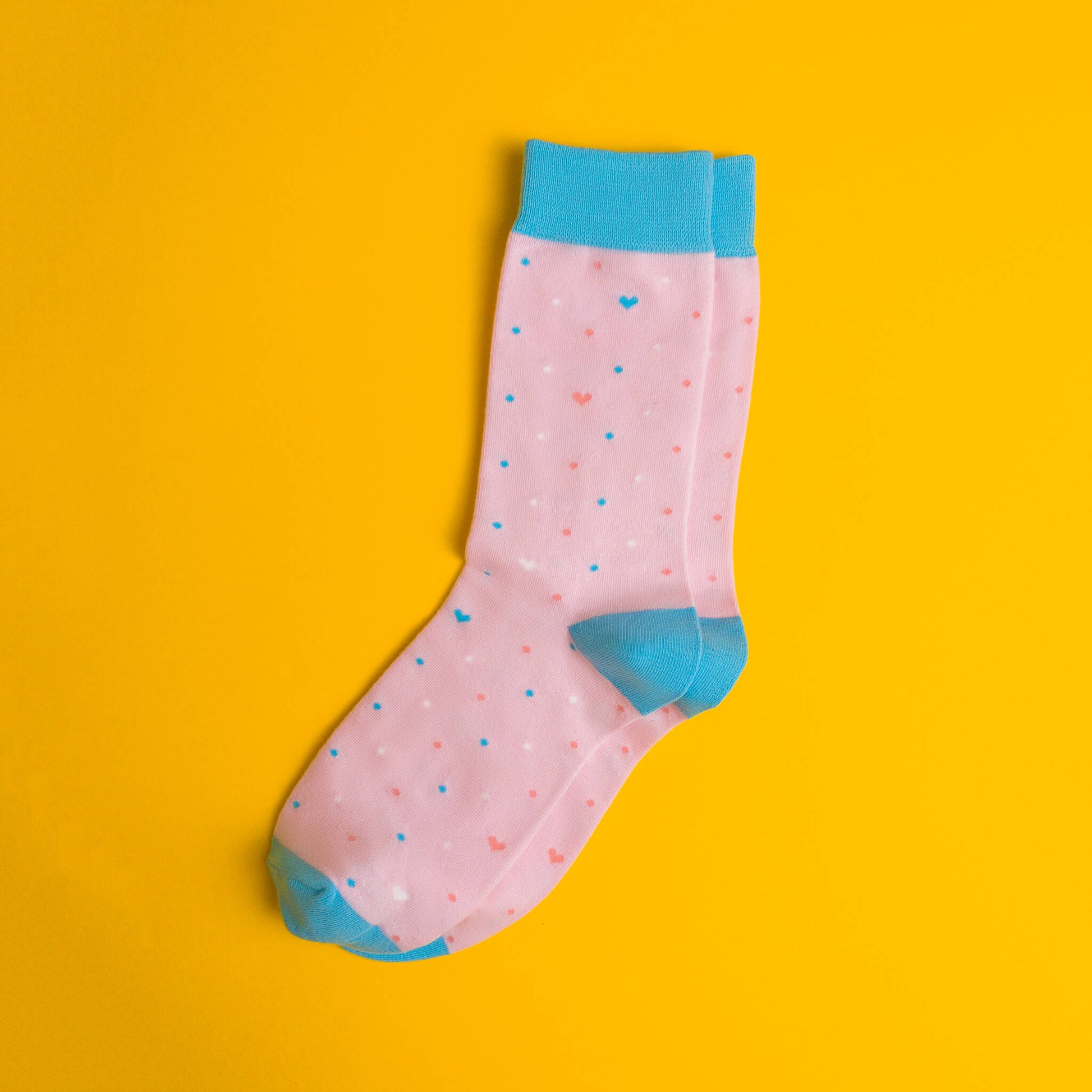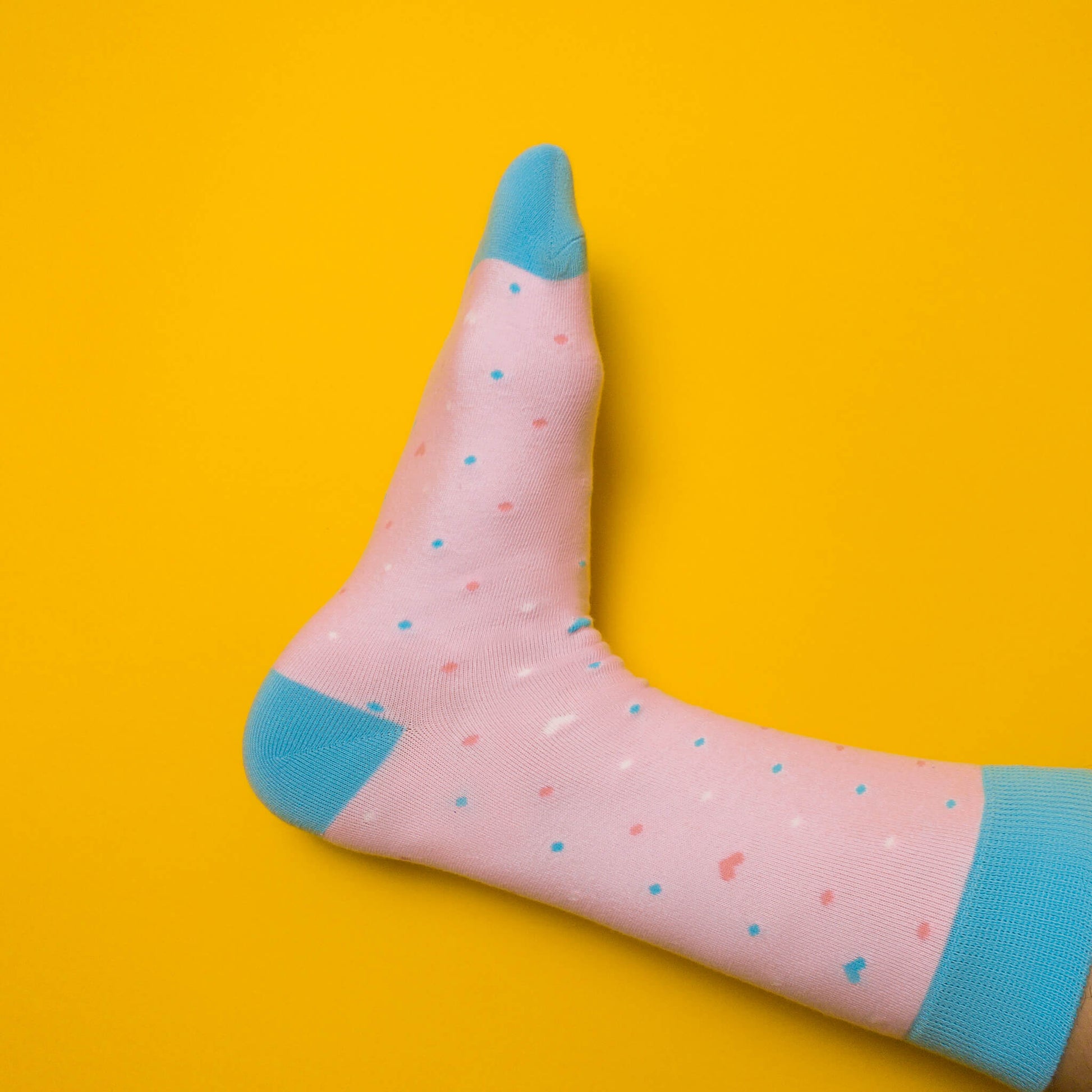 Celebrate your pride with these trans-coloured socks! Let the little white, blue, and pink dots fill your heart with pride as you strut about the place~