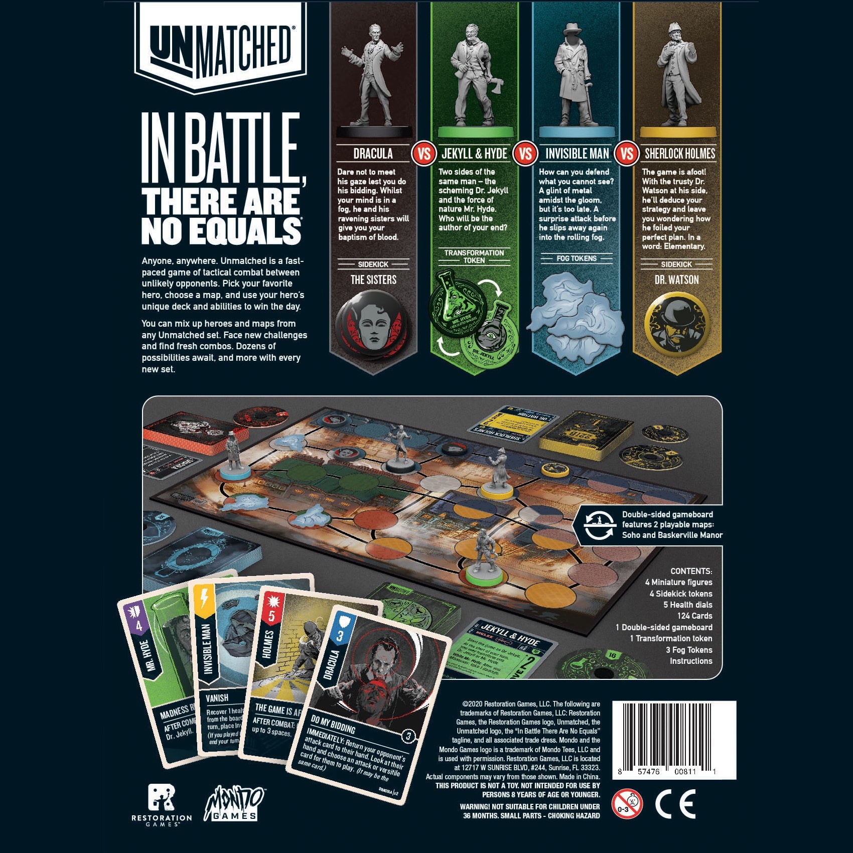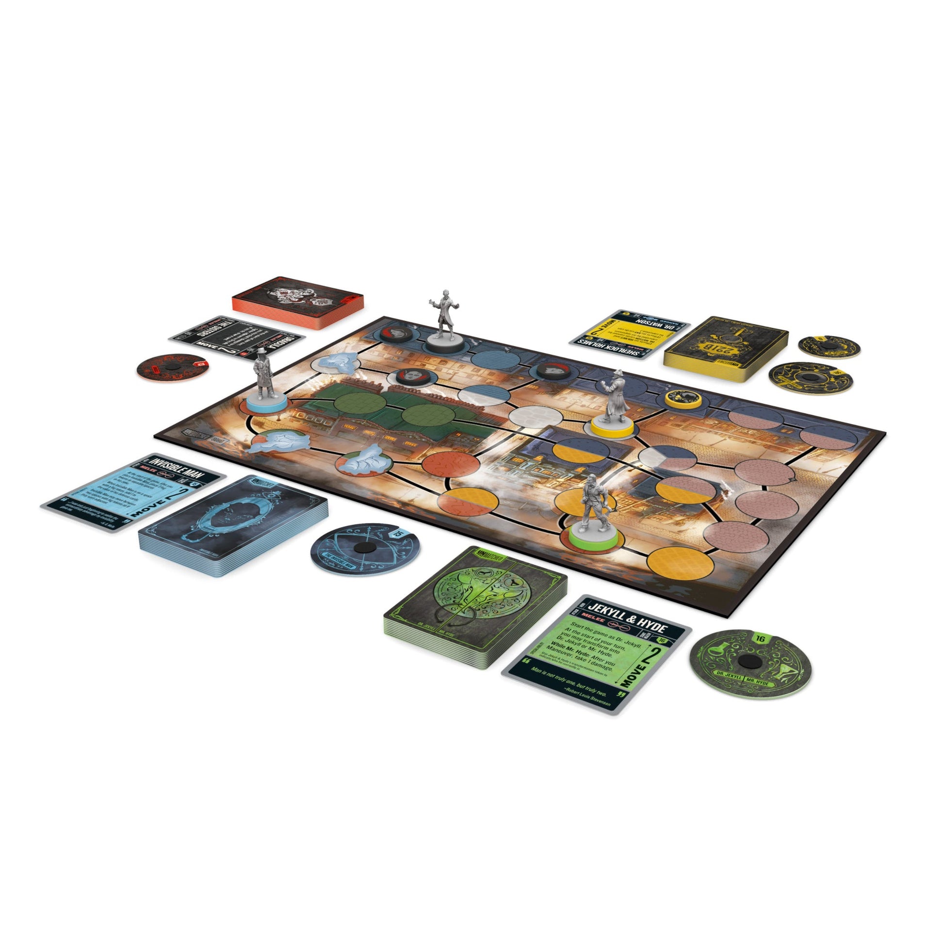 Unmatched is a highly asymmetrical card-driven miniature fighting game featuring heroes from myth and legend. Cobble & Fog includes Sherlock Holmes, Jekyll & Hyde, the Invisible Man, and Dracula and also features exciting new mechanics like secret passages and the Invisible Man’s fog tokens.