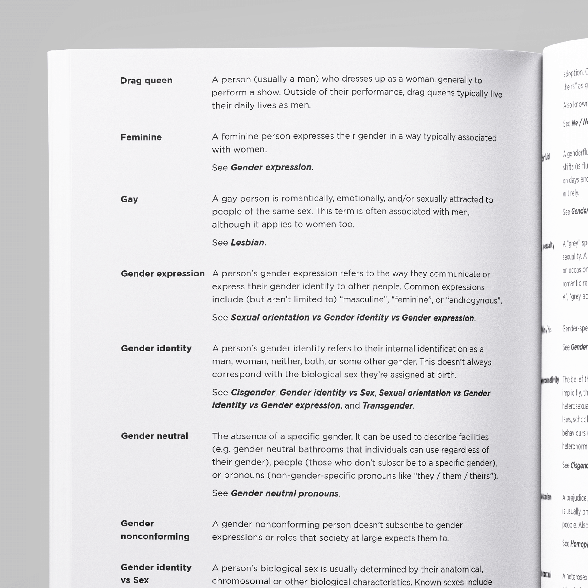 - 10 pages of LGBTQ+ Glossary at the end, containing 69 terms related to the community