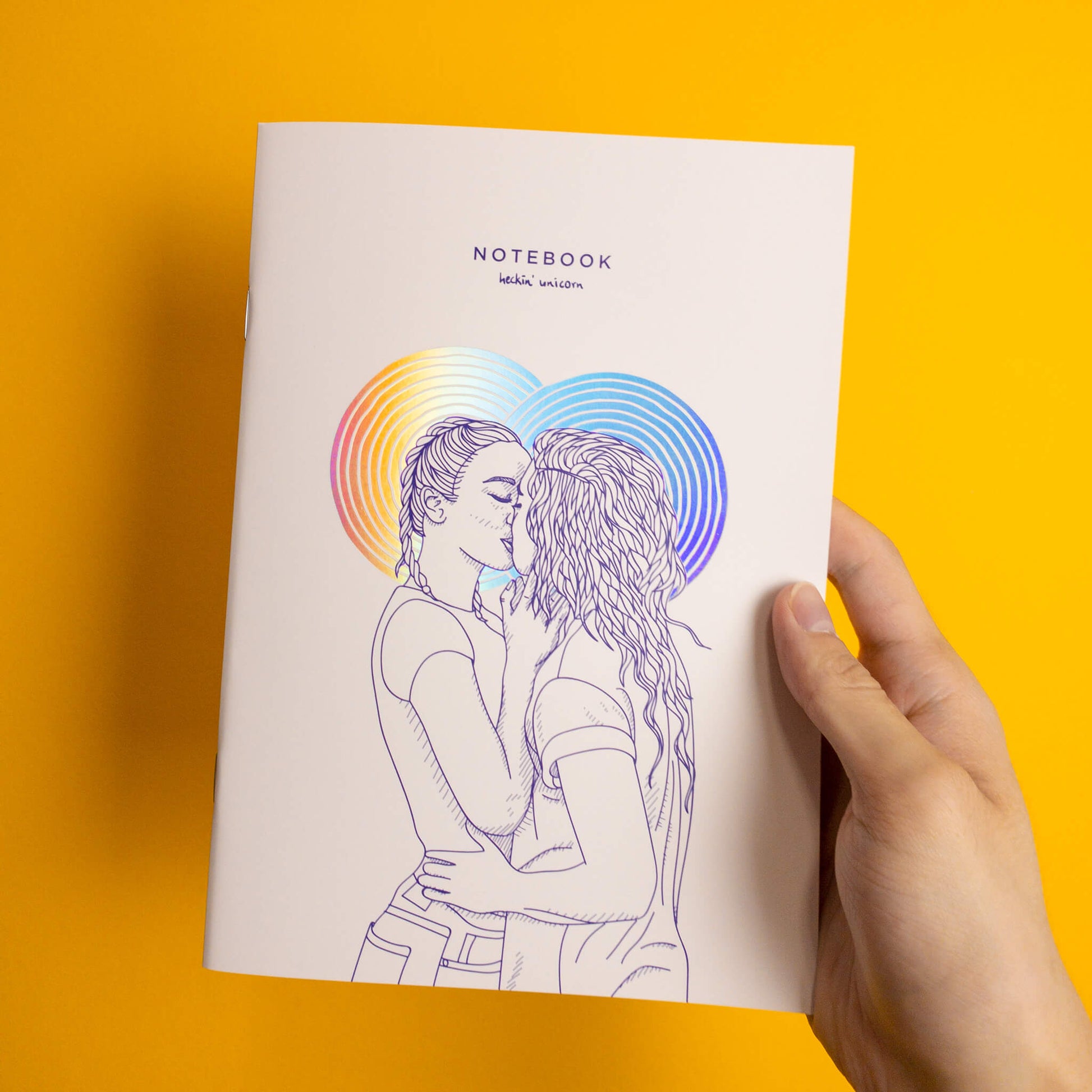 This "Women in love" notebook features an illustration of 2 women sharing an embrace, with lovely rainbow-foiled halos around their heads. The iridescent rainbow foil changes colours at different angles, so it dances and shimmers in the different colours of a rainbow.
